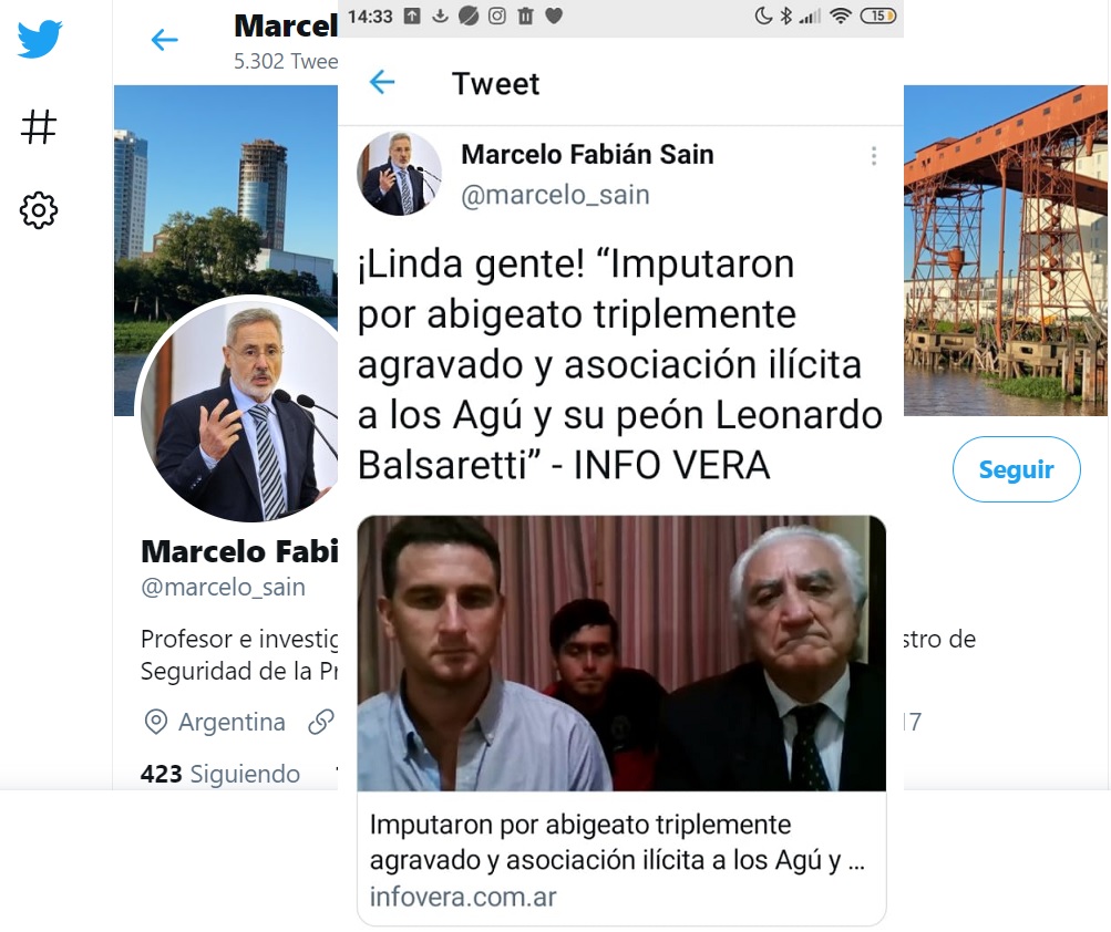 Con la leyenda “¡Linda gente!”, el ministro de Seguridad de la provincia, Marcelo Sain, publicó en cuenta de Twitter la nota sobre la imputación y prisión preventiva de Hernán Agú (p), su hijo Emilio Agú y el peón Leonardo Balsaretti.