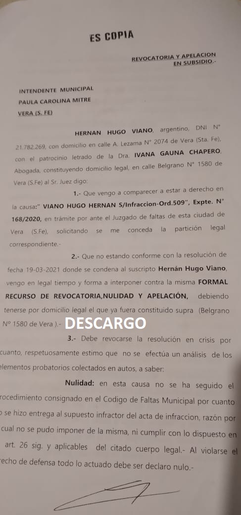 Esa sentencia fue recurrida por Viano. Por no estar conforme con la misma, interpuso formal recurso de revocatoria, nulidad y apelación en subsidio, y alegó que “debe revocarse la resolución en crisis por cuanto no se efectuó un análisis de los elementos probatorios colectados en las actuaciones”.