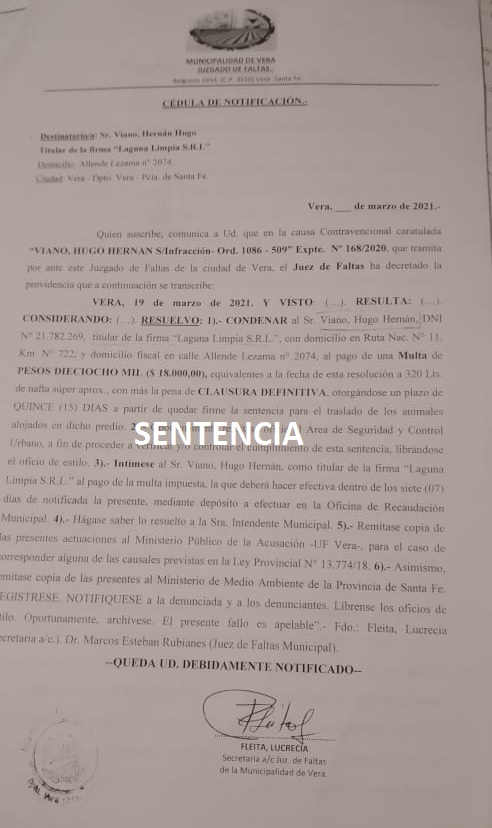 Con fecha 19 de marzo de 2021, el juez de Faltas Municipal resolvió condenar al empresario ganadero Hernán Viano, como titular de la firma Laguna Limpia SRL, al pago de una multa de 18 mil pesos y la clausura definitiva de un predio rural cercano a la zona urbana, y le dio 15 días de plazo para el traslado de los animales que supuestamente estaban alojados allí.