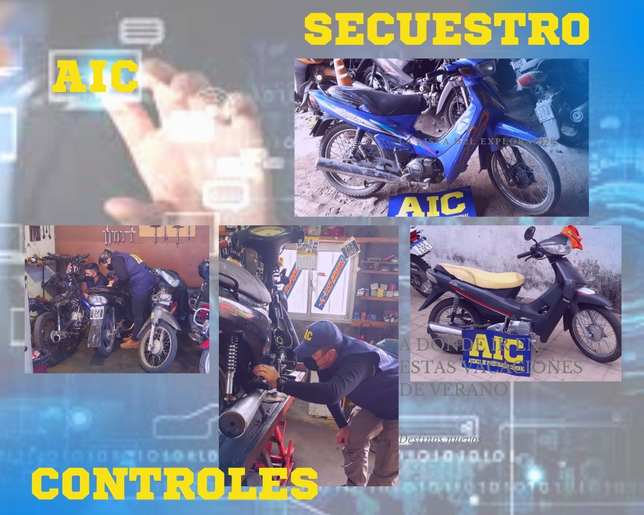 La Agencia de Investigación Criminal informa que lleva a cabo diferentes controles de moto vehículos en la vía pública y en talleres de reparación y mantenimiento. El objetivo es aumentar acciones específicas de control y seguridad; en consonancia con el trabajo profesional de los Agentes de investigación criminal.