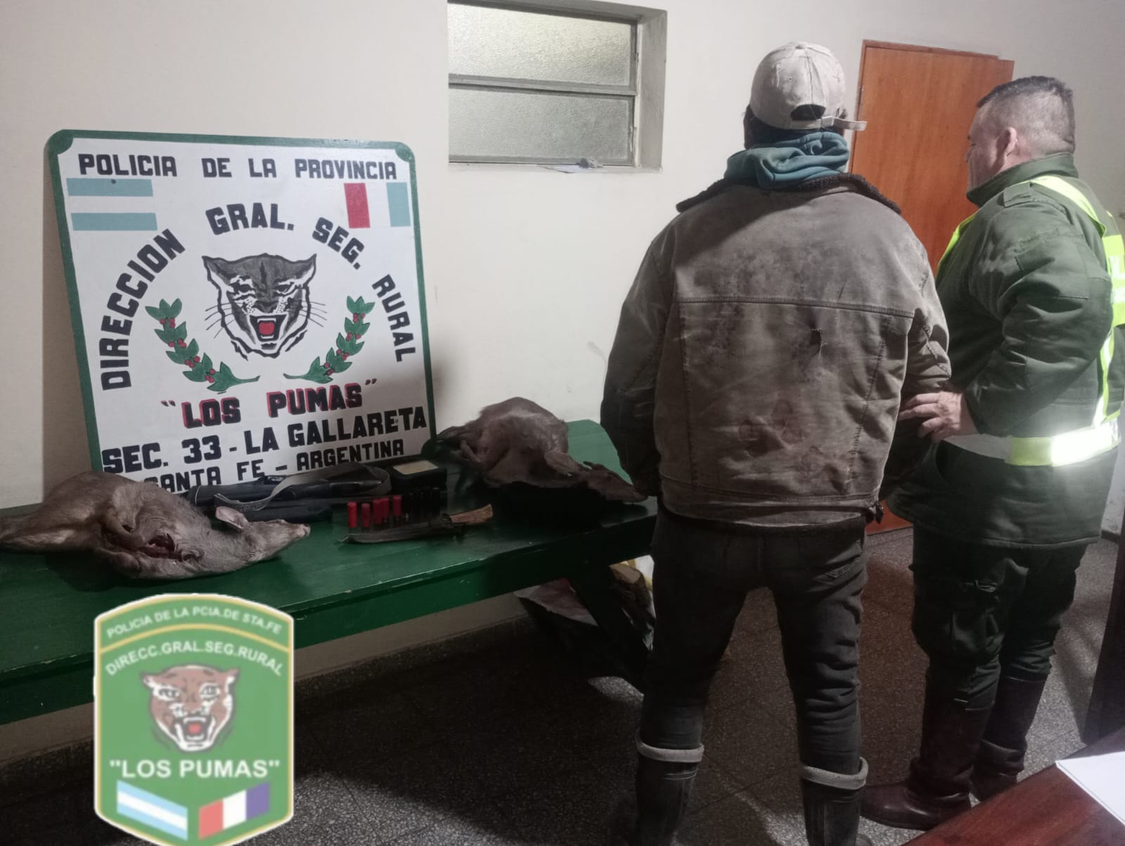 Al aguardar en las inmediaciones, los uniformados observaron a un sujeto que se acercaba al lugar. Al ser consultado, el hombre negó ser el dueño del vehículo y explicó que venía de cazar. En ese momento, exhibió una escopeta calibre 12 de un caño, nueve cartuchos recargados 12/70 sin marca visible, un cuchillo, una linterna y una mochila de jeans en cuyo interior llevaba dos guazunchos sin vida y eviscerados.