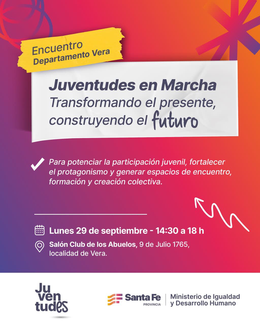 El Ministerio de Igualdad y Desarrollo Humano de la provincial lanzó una convocatoria para el lunes 29 de septiembre en la ciudad de Vera “para seguir construyendo un presente con más participación, más protagonismo y más espacios de formación y encuentro para, con y desde las juventudes”.