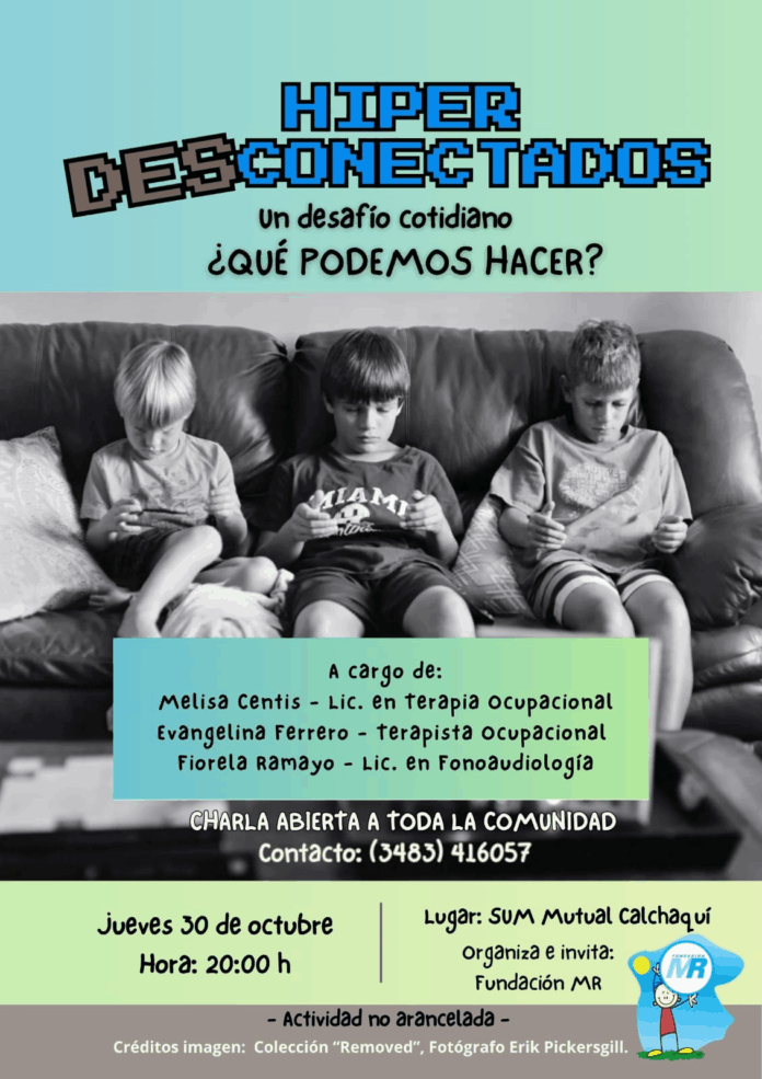 Fundación MR invita a participar de la charla “Des-conectados. Un desafío cotidiano”. Que se realizará el día 30 de octubre en el S.U.M. de la Mutual Calchaquí F.C.