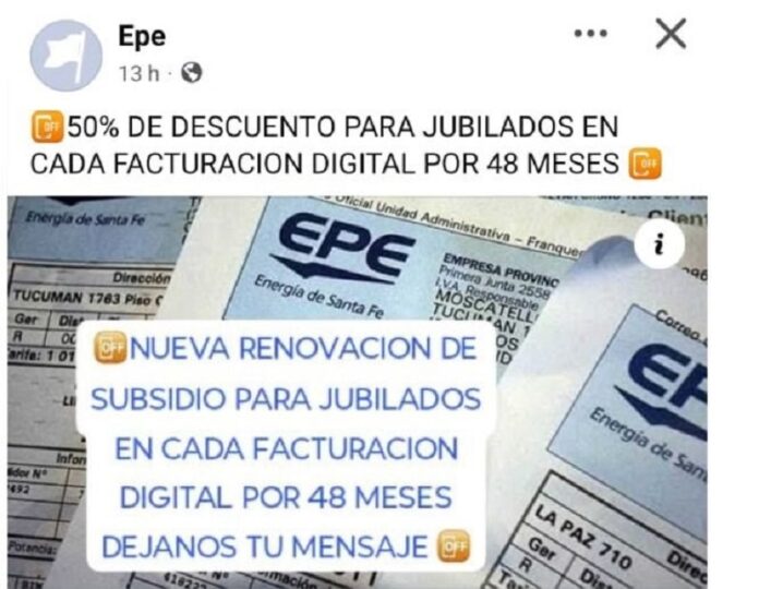 Personal de la Empresa Provincial de la Energía (EPE) ha tomado conocimiento que circulan en redes sociales publicaciones engañosas con beneficios exagerados para los usuarios, fundamentalmente jubilados. Esto se suma a otros intentos de estafas vía whatsapp o correo electrónico.