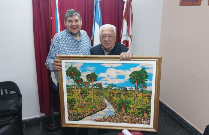 A manera de retribución, el sacerdote lo sorprendió con el obsequio de un cuadro, pintado por él mismo, que refleja la escenografía de un paisaje típico de la zona, donde sobresale un palmar como principal protagonista de una imagen que impacta al observar por su realismo y color.