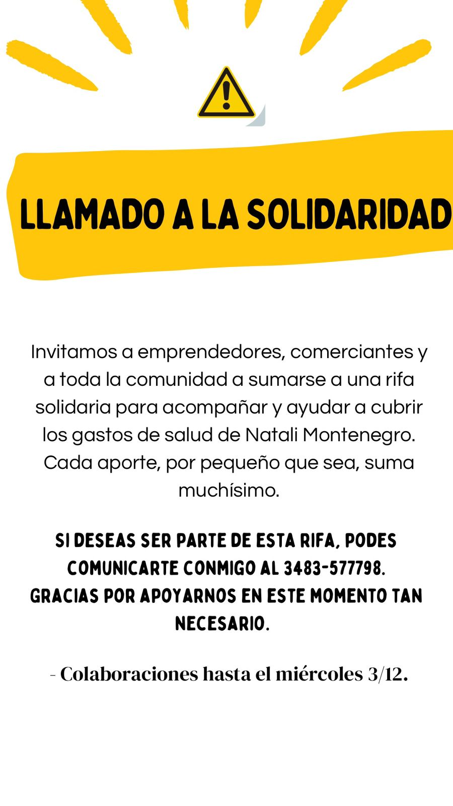 “Invitamos a emprendedores, comerciantes y a toda la comunidad a sumarse a una rifa solidaria para acompañar y ayudar a cubrir los gastos de salud de Natali Montenegro. Cada aporte, por pequeño que sea, suma muchísimo”, expresaron sus familiares, que publicaron un teléfono para quienes deseen colaborar: 3483-577798