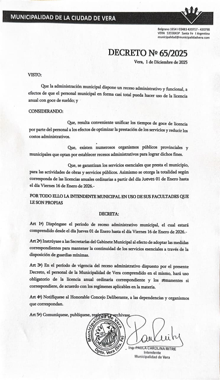La intendenta de Vera, Paula Carolina Mitre, decidió intervenir sobre el régimen de descanso del personal municipal mediante la firma del Decreto N.º 65/2025, que reduce el receso administrativo de enero a solo 15 días corridos, dejando atrás el esquema que históricamente abarcaba todo el mes.