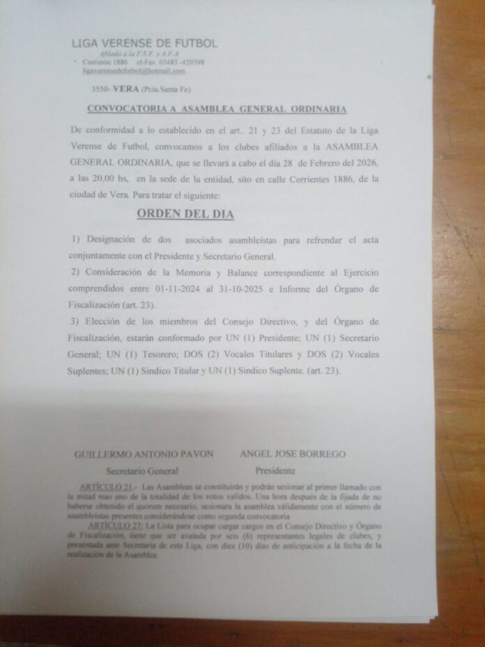 La Liga Verense de Fútbol convoca oficialmente a los clubes afiliados a participar de la Asamblea General Ordinaria, que se realizará el 28 de febrero de 2026, a las 20:00 horas, en la sede de la entidad, ubicada en calle Corrientes 1886, de la ciudad de Vera.