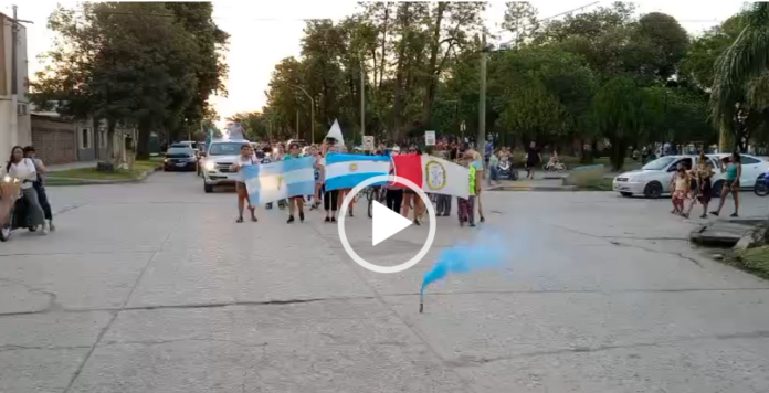 Los manifestantes surcaron calle San Martín para luego enfilar hasta el frente de la Unidad Regional XIX, donde se apostaron con carteles, palmas y entonaron el Himno Nacional Argentino.