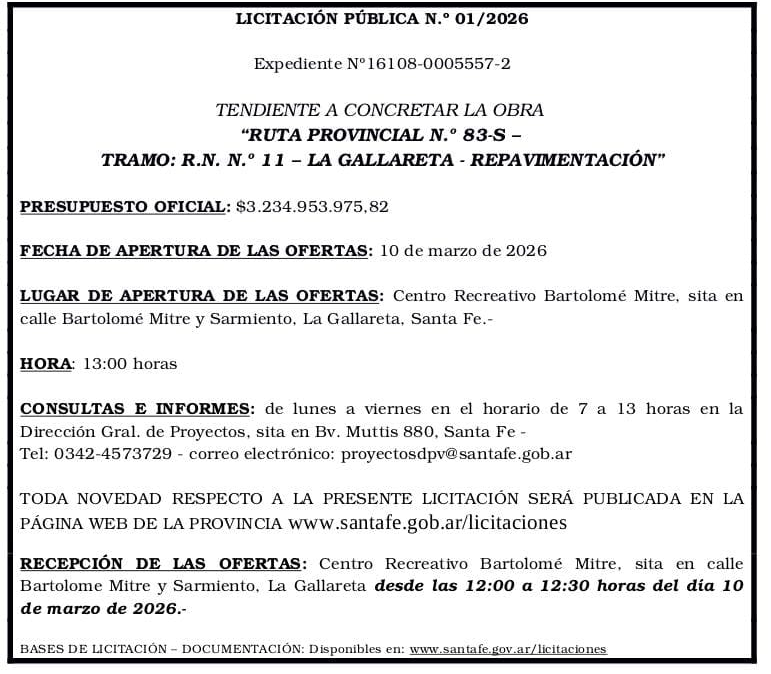 El presidente comunal de La Gallareta, Fernando Nicola, anunció una noticia histórica para la localidad: ya tiene fecha la apertura de sobres de la licitación de la Ruta Provincial 83S, una obra largamente esperada que permitirá completar la repavimentación del ingreso al pueblo y dejarlo totalmente renovado.