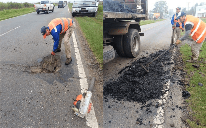 Con personal y equipos propios se realizan bacheos de transitabilidad entre Candioti y Nelson, con material asfáltico en frío y reducción momentánea de carril y paso alternado coordinado por banderilleros.