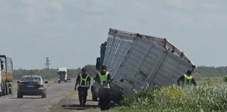 Malabrigo: un camión cargado con postes de quebracho cayó en una alcantarilla al estacionar en la banquina